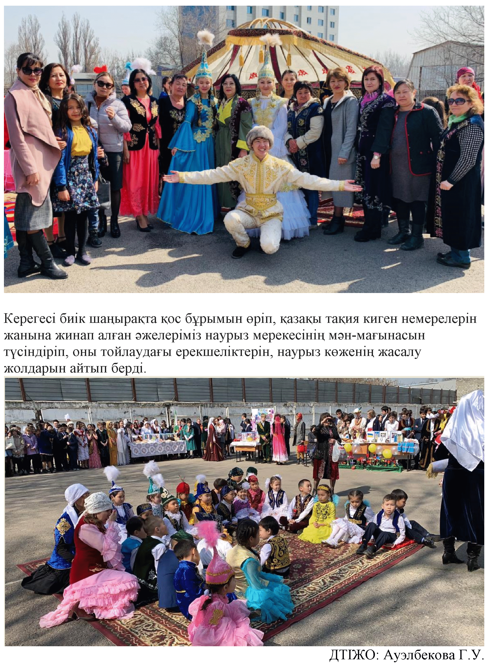 Кішкентай баланың аяғына ала жіп байлап, тұсауын кесу- оның аяғынан тік тұрып, сүрінбей ер жетсін деген қазақтың әдемі салт-дәстүрлерінің бірі. Тәттілерді шашып, келгендерге үлестіру де өмірі тәтті өтсін деген ниеттен туған салт. Мектебімізде Ұлы далағың – Ұлы мерекесін тойлауды осындай дәстүрді сахналаудан бастады. Ақ арғымағына мінген Қыдыр ата жыйылған көпке ақ батасын беріп, мактеп ұстаздары мен ата-аналар қауымы салт-дәстүр мен әдет- ғұрып жаскелең жас ұрпақтың санасында мәңгі жатталсын деген оймен Наурыздың ерекшелігін көріністерде көрсетті.