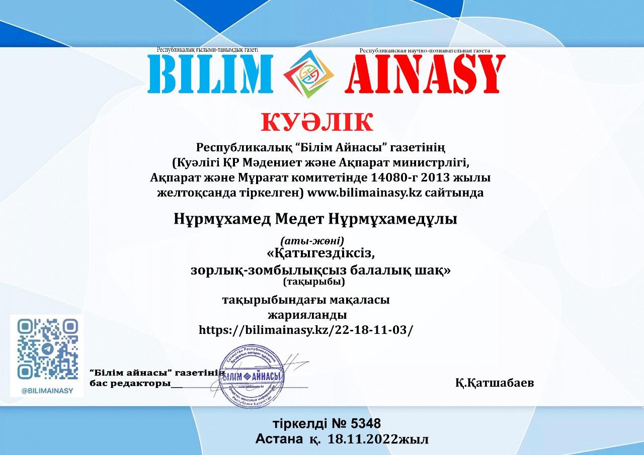 "Қатыгездіксіз, зорлық-зомбылықсыз балалық шақ" республикалық науқаны аясында "Білім айнасы" журналына "Қатыгездіксіз, зорлық-зомбылықсыз балалық шақ" тақырыбындағы мақаласы жарық көрді