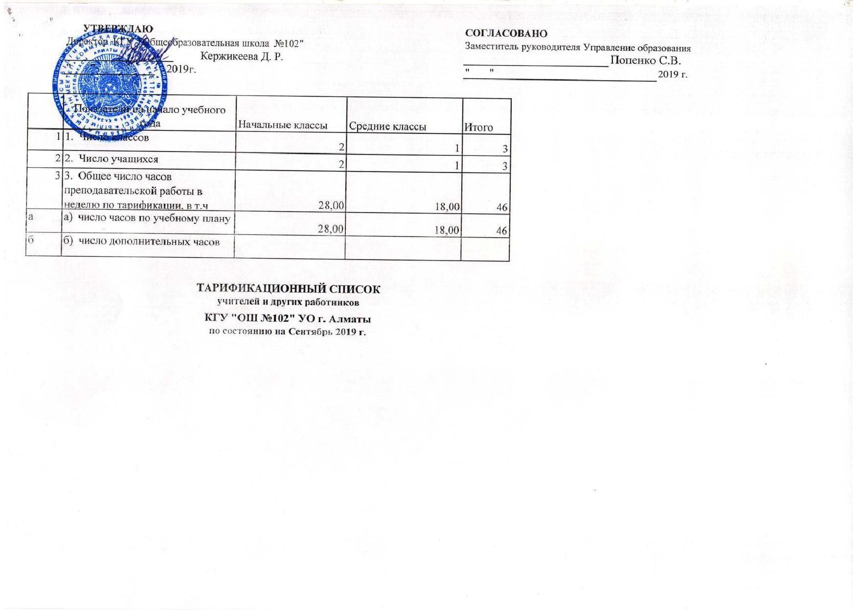 01.09.2019 жылғы штат кестесі және тарификациялау тізімі » КГУ «общеобразовательная школа №102» Управления образования г. Алматы