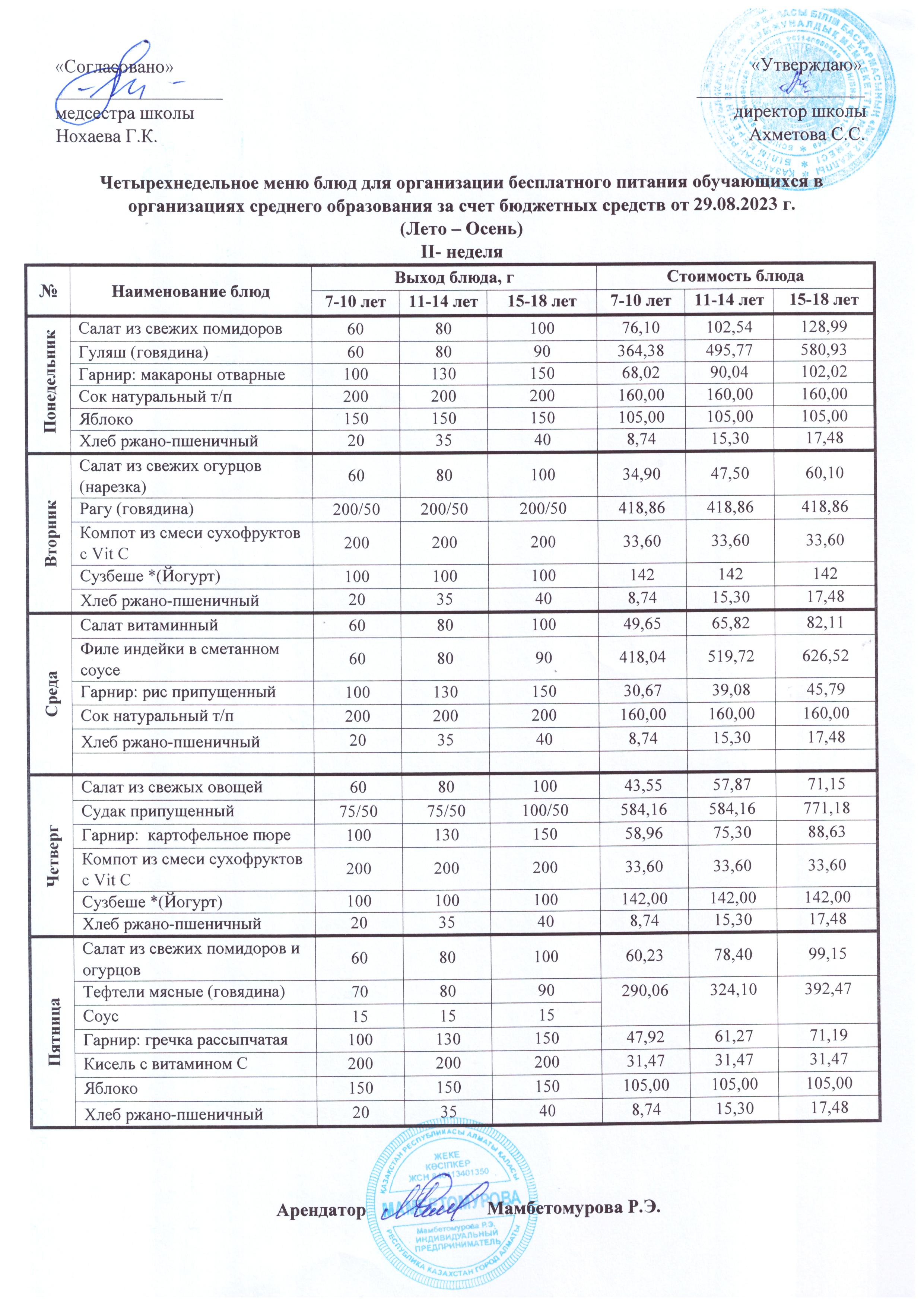 01 қыркүйек 2023 0 1 2 3 4 5 Жалпы мектеп қоры есебінен тегін тамақ ішетін оқушылардың апталық мәзірі