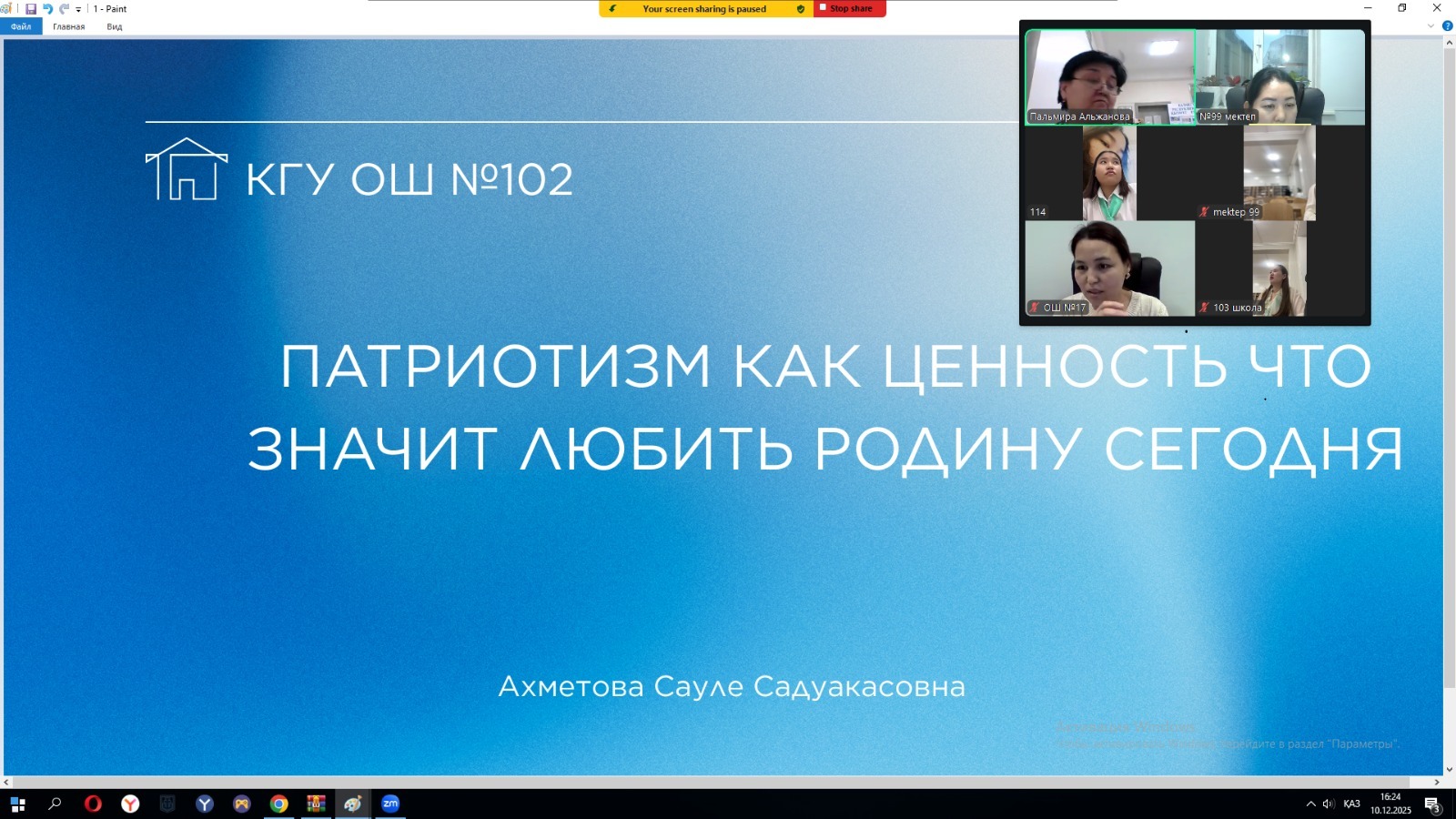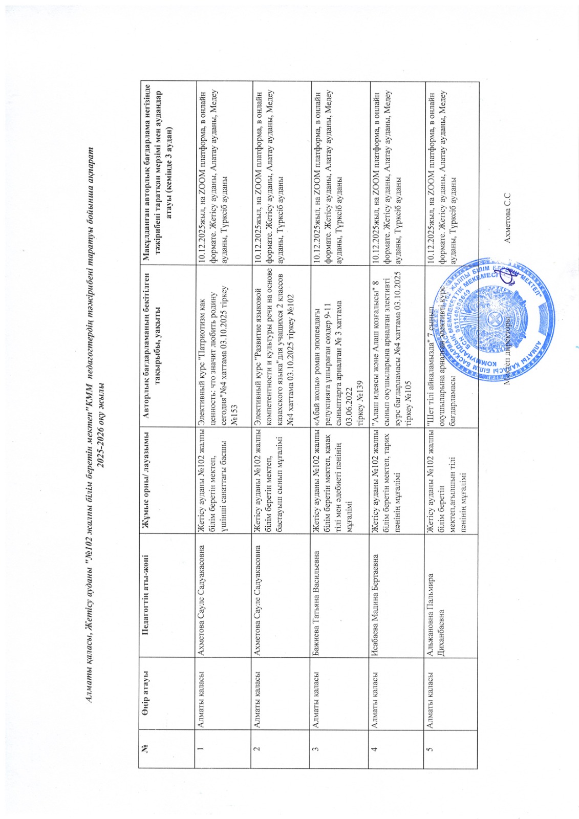 Алматы қаласы, Жетісу ауданы №102 жалпы білім беретін мектептің 2025-2026 оқу жылы мектебімізде «педагог-зерттеуші» біліктілік санатына растайтын және педагог-зерттеуші санатына өтініш берген педагогтер 10.12.2025ж Алматы қаласы бойынша "Қалалық білім берудегі жаңа технологиялардың ғылыми әдістемелік орталығы" бекіткен оқу-әдістемелік (авторлық жұмыстары) жұмыстарының тақырыбы бойынша тәжірибе таратты.