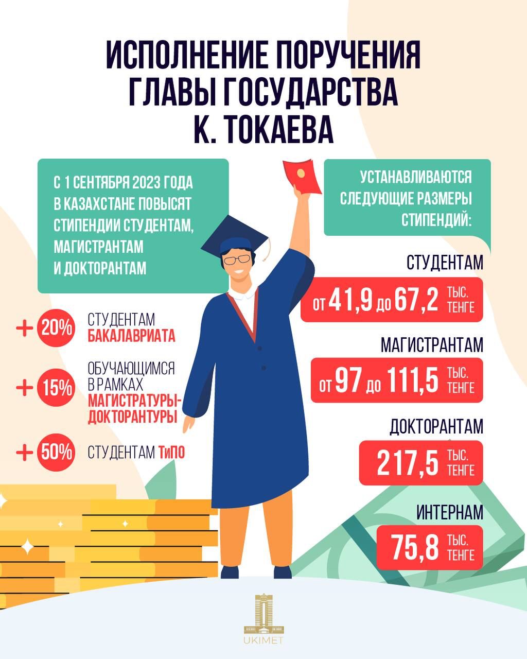 18 тамыз 2023 0 1 2 3 4 5 Мемлекет басшысы Қасым-Жомарт Кемелұлы Тоқаевтың тапсырмасын іске асыру туралы 2023 жылғы 1 қыркүйектен бастап Қазақстанда студенттер, магистранттар мен доктаранттар шәкіртақысы көтерілмек...