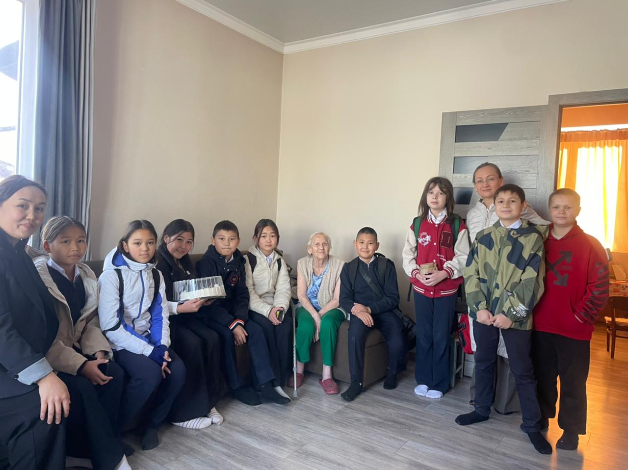 Қамқорлық пен құрметке толы осы айда 5 "А" және 5 "Б" сынып оқушылары зейнеткер Хортунова Валентина апайдың үйіне арнайы барып, құттықтап қайтты.