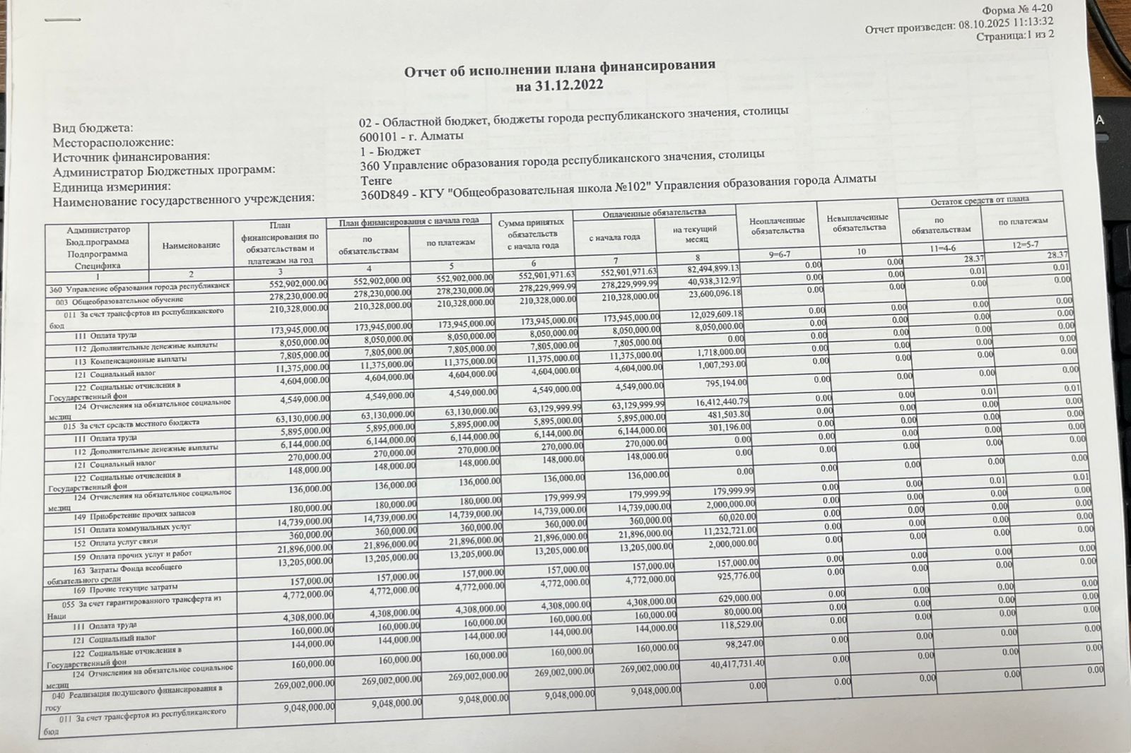 отчет об исполнении плана финансирования » КГУ «общеобразовательная школа №102» Управления образования г. Алматы