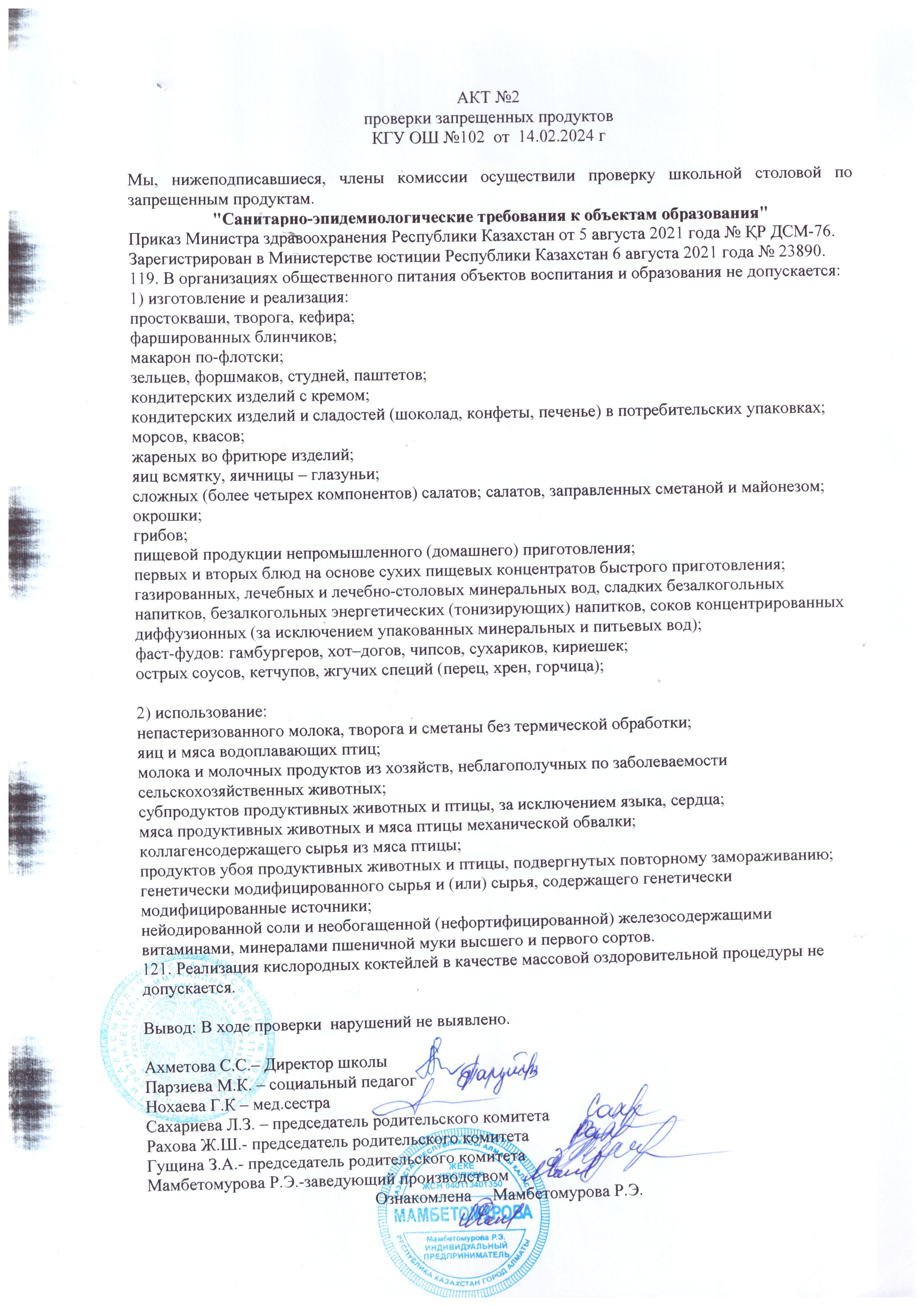 АКТ №2 проверки запрещенных продуктов » КГУ «общеобразовательная школа №102» Управления образования г. Алматы
