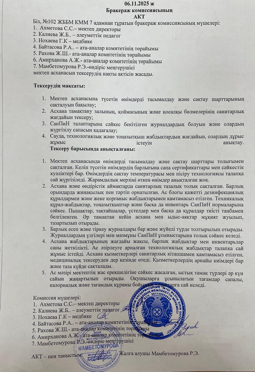 Мектеп асханасының бракераждық комиссия актісі » КГУ «общеобразовательная школа №102» Управления образования г. Алматы