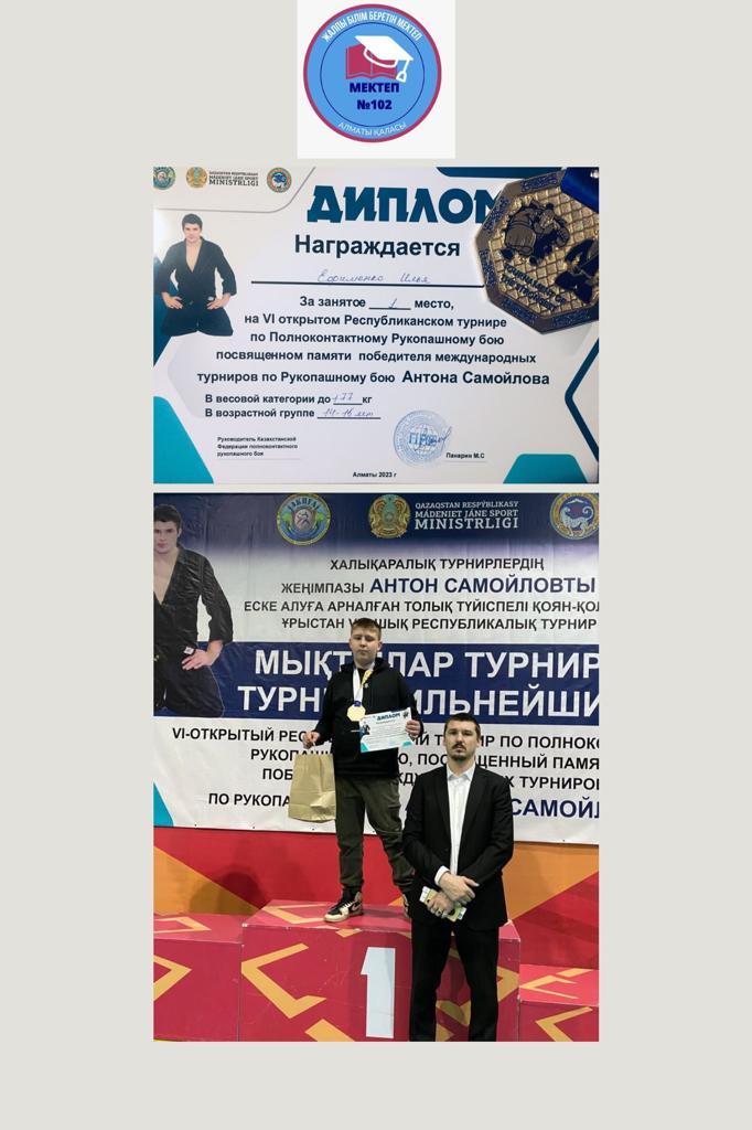 26 қаңтар 2023 0 1 2 3 4 5 Оқушыларымызбен мақтанамыз! Халықаралық қоян-қолтық жекпе-жек турнирлерінің жеңімпазы Антон Самойловты еске алуға арналған толық контактілі қоян-қолтық ұрыстан VI ашық республикалық турнирде 1 орын алғаны үшін 8 "Б" сынып оқушысы Ефименко Илья марапатталады. Құттықтаймыз!
